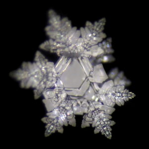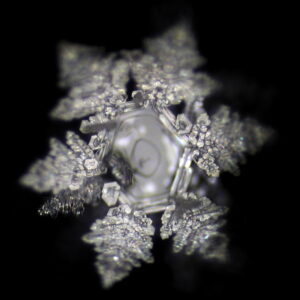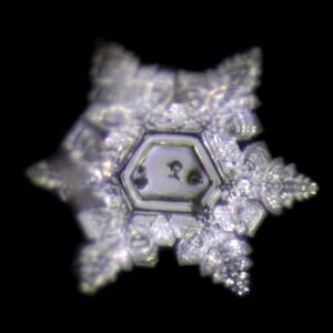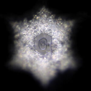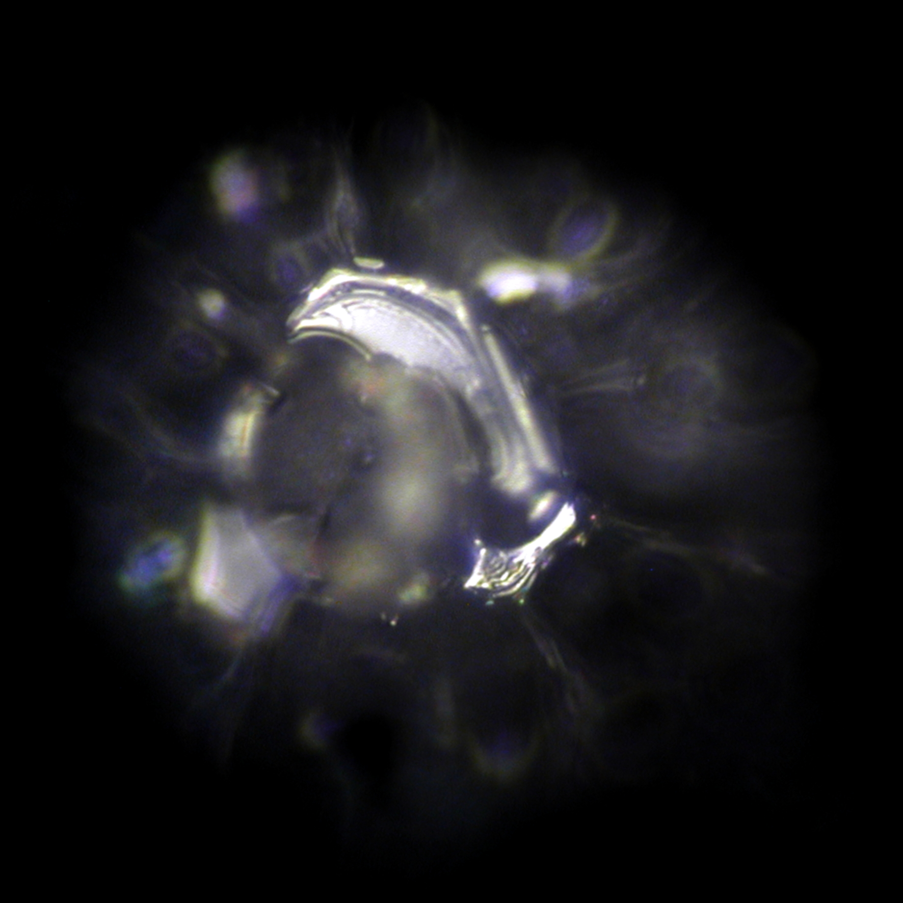 • Krystaly destilované vody, která stála 3h v lahvičce na FlowDiscu